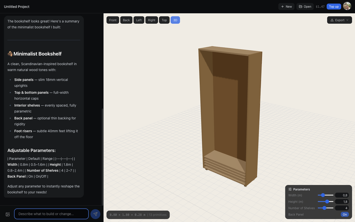 Use parametric sliders to tweak dimensions, shelf count, or toggle features. Or just say "make it wider" or "add a back panel" — the model updates instantly.
